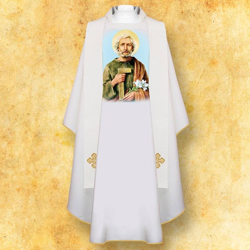 Joseph, vigilant défenseur de Jésus, tu nous enseignes la richesse de notre foi.  Chasuble richement brodée l'avant et l'arrière.  Tissu de qualité  "tropic italien", un  mélange de fibres naturelles et synthétiques,  respirant et léger,  facile à entretenir.  Couleur écru.  Etole intérieure appropriée.