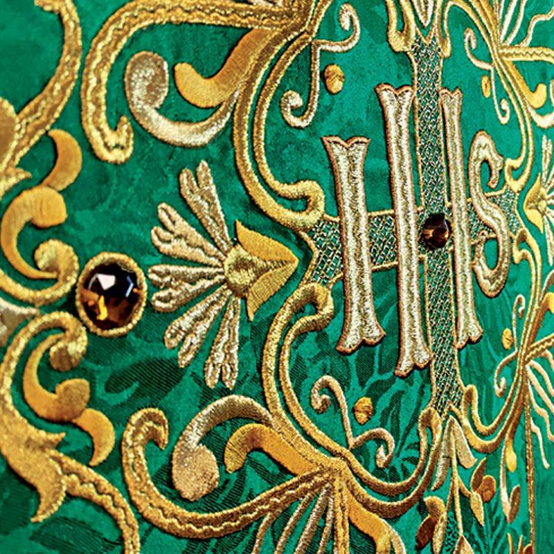 Chasuble décorée de broderie de qualité supérieure et petits cristaux l'avant et l'arrière, finition dorée. Etole intérieur approprié.
