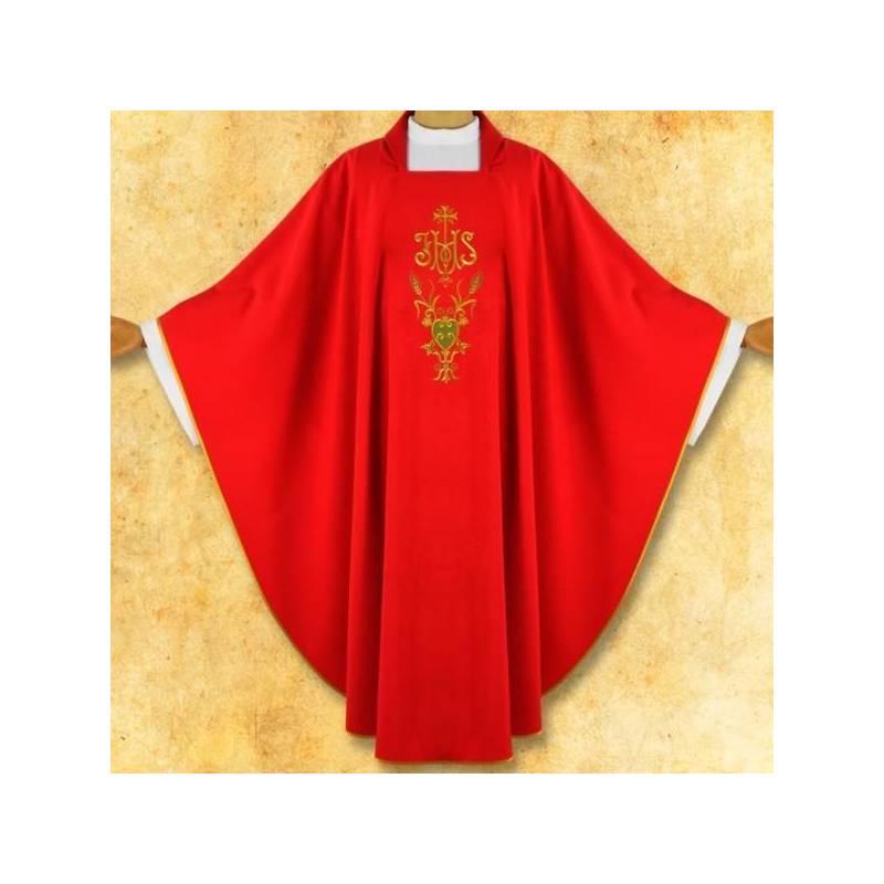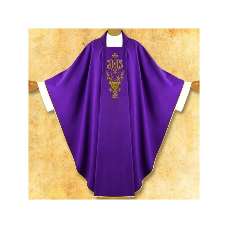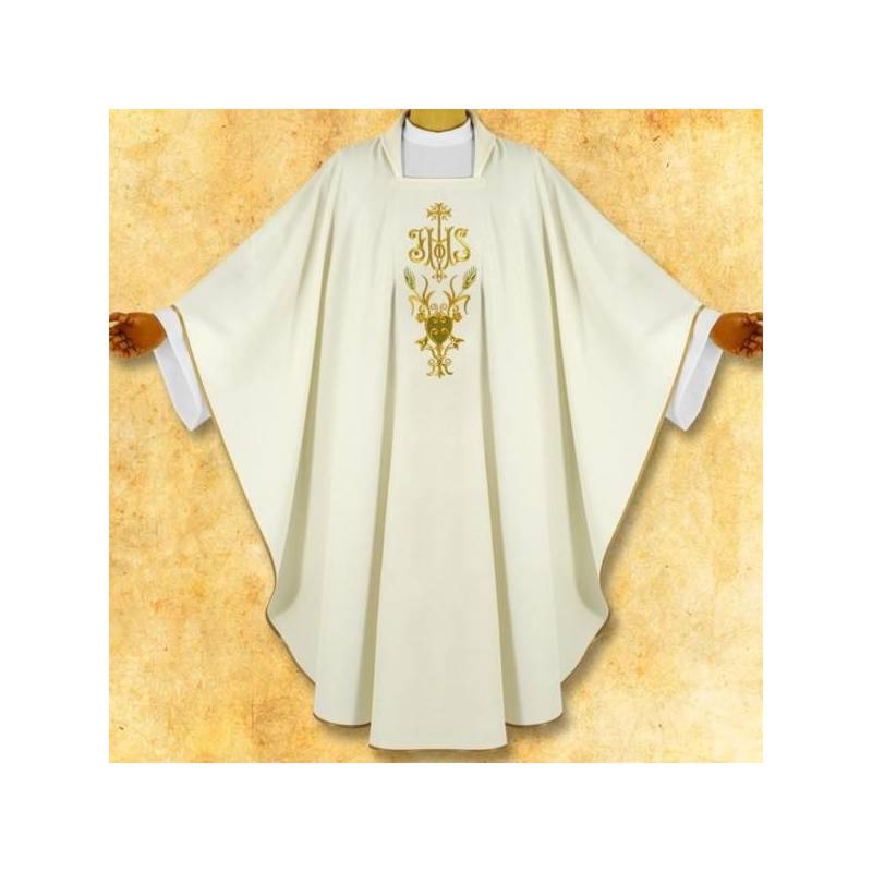 Chasuble "JHS", simple et élégante, décorée l'avant et l'arrière de broderies, finition dorée. Etole intérieur approprié.