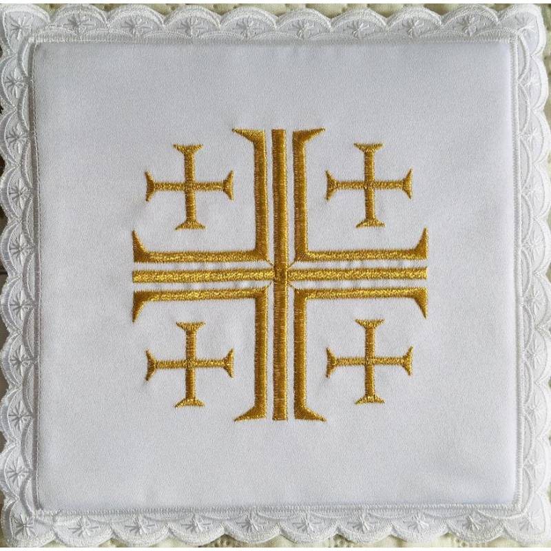 -pale brodée : 20 cm x 20 cm / corporal brodé : 45 cm x 45 cm / purificatoire brodé : 23 cm x 45 cm / manuterge à ourlet brodé : 23 cm x 45 cm