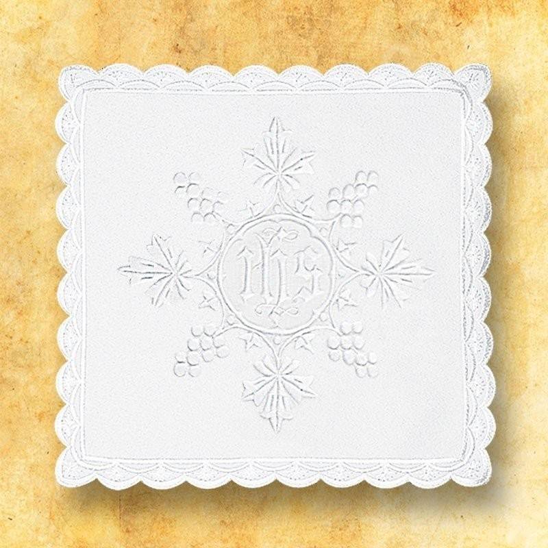 -pale brodée : 20 cm x 20 cm / corporal brodé : 45 cm x 45 cm / purificatoire brodé : 23 cm x 45 cm / manuterge à ourlet brodé : 23 cm x 45 cm