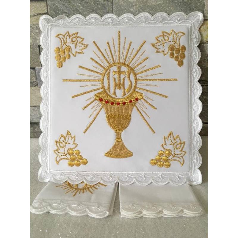 -pale brodée : 20 cm x 20 cm ( dedans un carré de plastique déhoussable pour le lavage) / corporal brodé : 45 cm x 45 cm / purificatoire brodé : 23 cm x 45 cm / manuterge à ourlet brodé : 23 cm x 45 cm