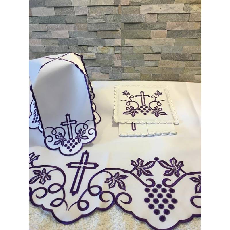 -pale brodée : 20 cm x 20 cm ( dedans un carré de plastique déhoussable pour le lavage) / corporal brodé : 45 cm x 45 cm / purificatoire brodé : 23 cm x 45 cm / manuterge à ourlet brodé : 23 cm x 45 cm