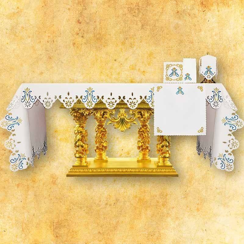Tissu de bonne qualité, résistant au tâches, facile d'entretien, couleur: blanc, fil d’or et bleu.