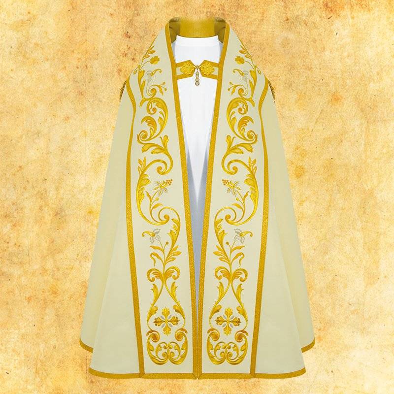 Le Christ est tout pour nous : Si tu as besoin de secours : Il est la force, Si tu crains la mort : Il est la Vie... Chape liturgique. Broderie florale de haute qualité devant et l’arrière. Tissu : satin-atlas, avec doublure, couler: violet OU rouge La chape est fournie avec son étole intérieure et un fermail décore