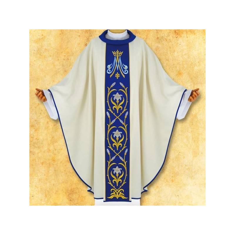 Chasuble Mariale l'avant et l'arrière décorée de broderies de qualité supérieure, finition bleu foncé. Etole intérieur approprié.