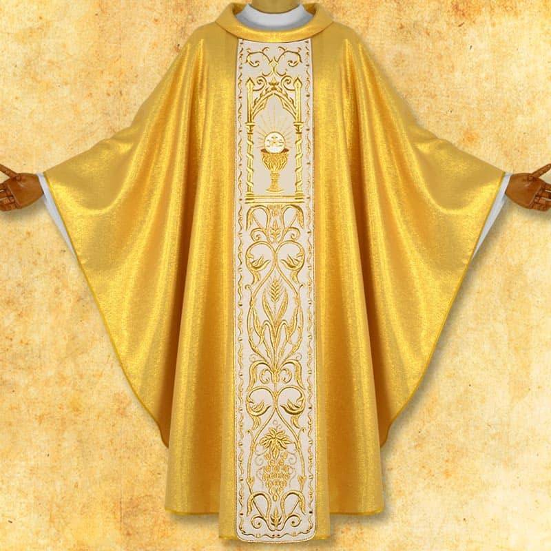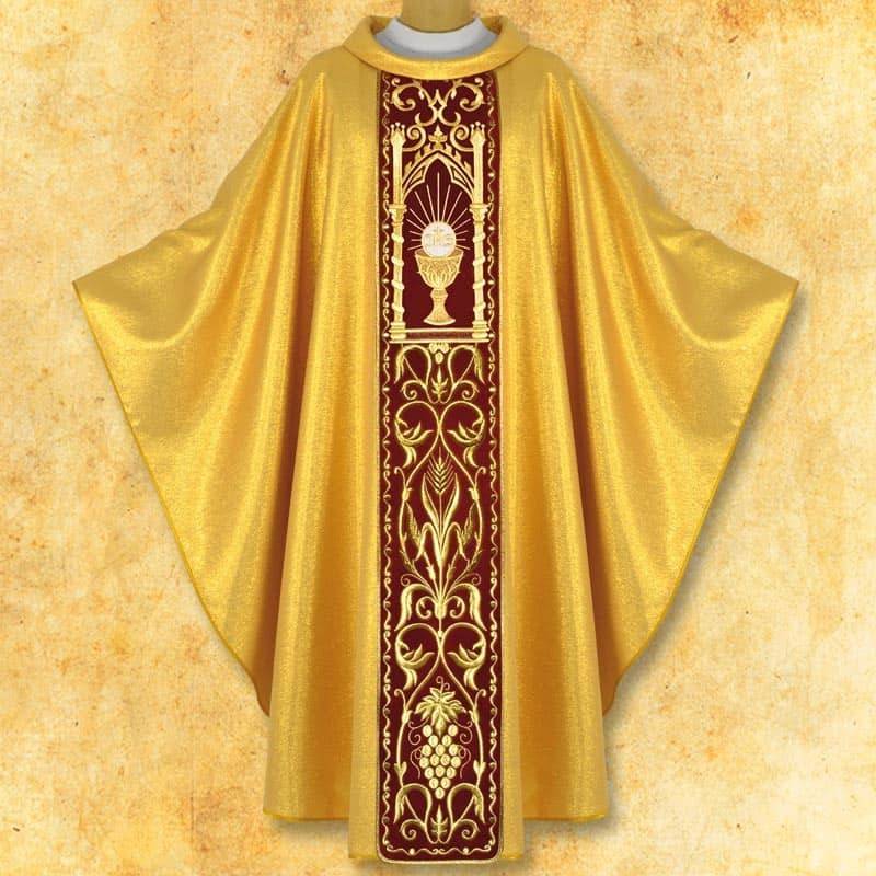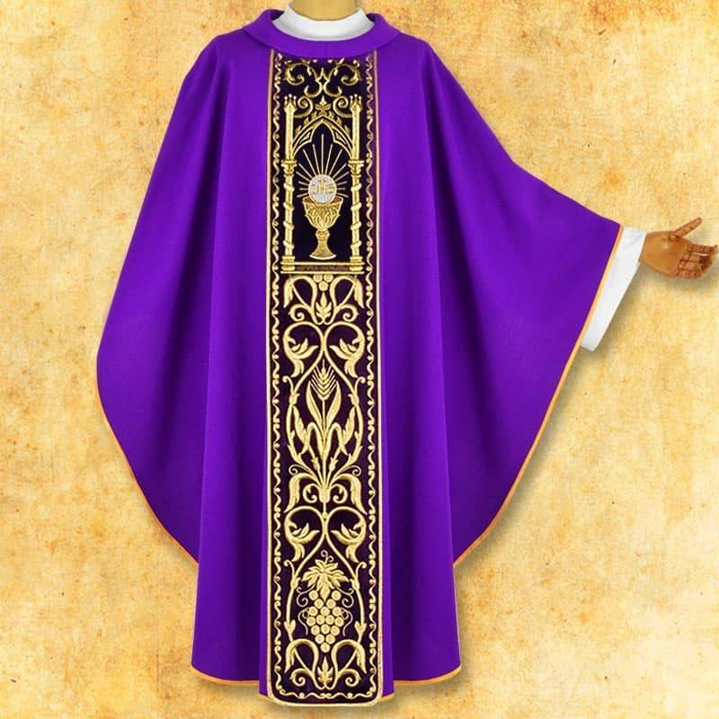 "Pendant qu'ils mangeaient, Jésus prit du pain et prononça la prière de bénédiction.."Mt., 26.26. Magnifique chasuble  brodée.  Broderie de qualité supérieure sur une bande l'avant et l'arrière. Etole intérieur approprié. Tissu: nid d'abeille, un mélange de fibres naturelles et synthétiques, très aéré, doux et léger, infroissable.