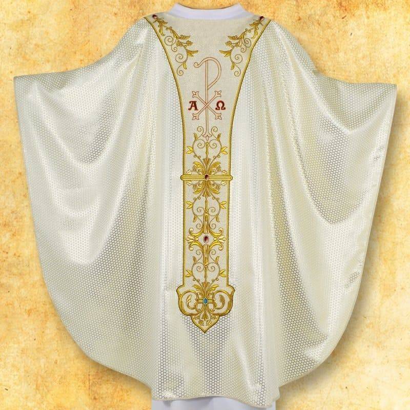 Magnifique chasuble avec son étole, décorée richement de broderies de qualité supérieure l'avant et l'arrière.