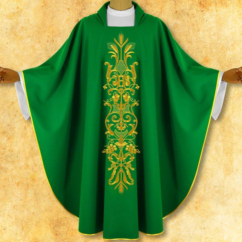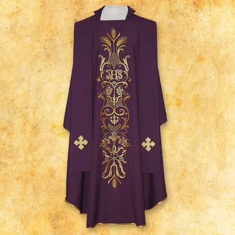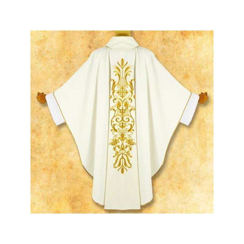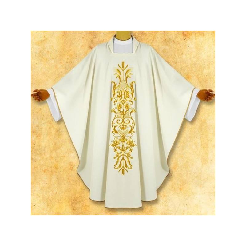 Chasuble   décorée de broderie de qualité supérieure  l'avant et l'arrière, finition dorée. Etole intérieur approprié. Tissu : tropic italien de qualité , aéré, doux et léger à cause de tissage lâche, infroissable. Couleur à votre choix: écru, violet, rouge ou vert.