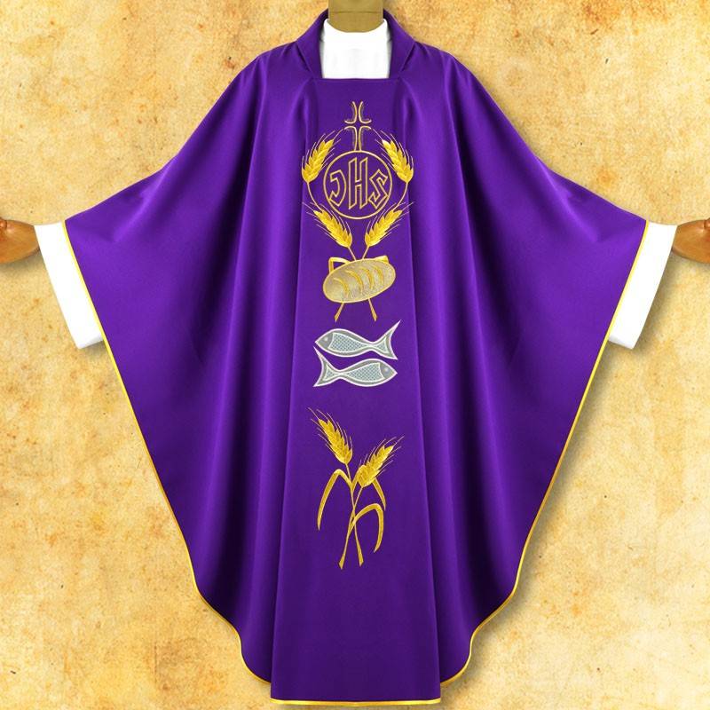 Très élégante chasuble "JHS", décorée l'avant et l'arrière  de broderies, finition dorée. Etole intérieur approprié. Tissu : tropic italien, de très bon qualité , très aéré, fine et léger à cause de tissage lâche, infroissable. Couleur à votre choix: écru, violet, rouge, vert ou complet.