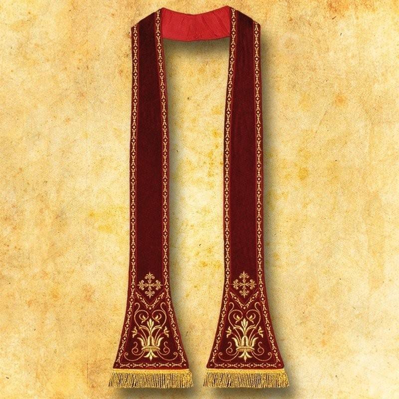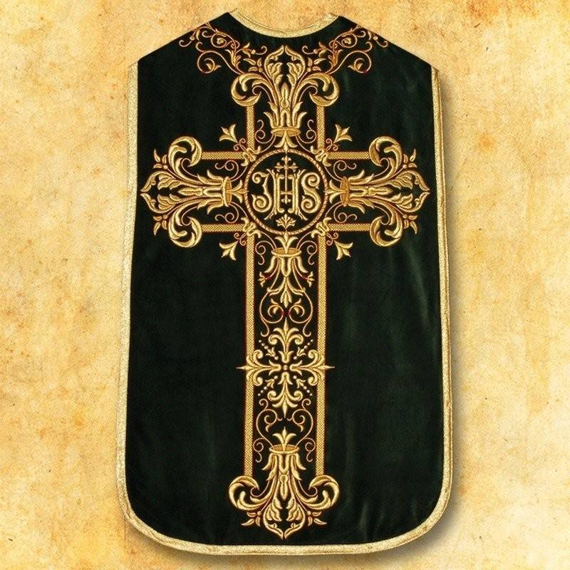 Chasuble romaine - complet est fabriqué en tissu satiné de haute qualité.Le tissu est très agréable au toucher avec une brillance subtile.Légers, renforcés avec un doux tissu non tissé. Cousu dans une doublure en satin de la même couleur.Chasuble l'avant et l'arrière décore de broderies de qualité supérieure, finition dorée. L'ensemble se compose d'une...