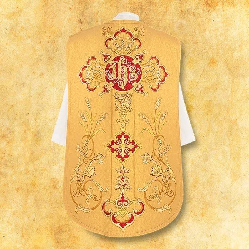 Chasuble romaine décorée l’avant et l’arrière de broderie de qualité,