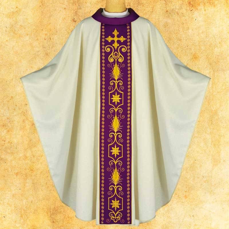 Magnifique chasuble richement brodée. Broderie de qualité supérieure sur une bande l'avant et l'arrière. Etole intérieur approprié.