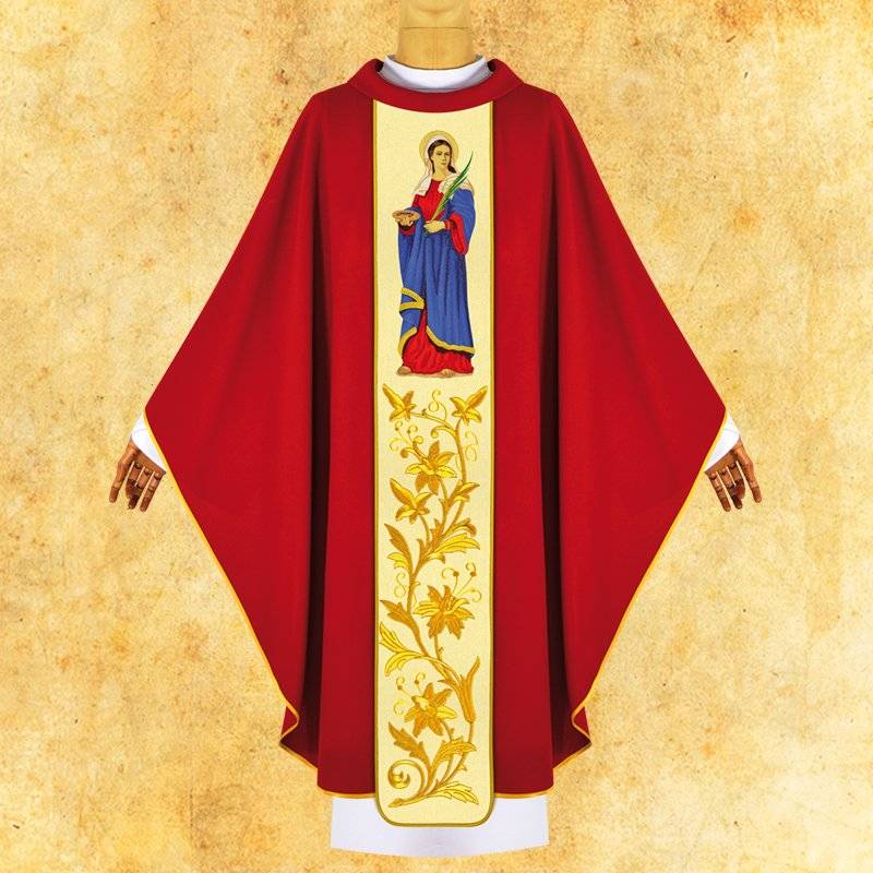Magnifique chasuble rouge, richement brodée l'avant et l'arrière, finition dorée. Etole intérieure incluse.