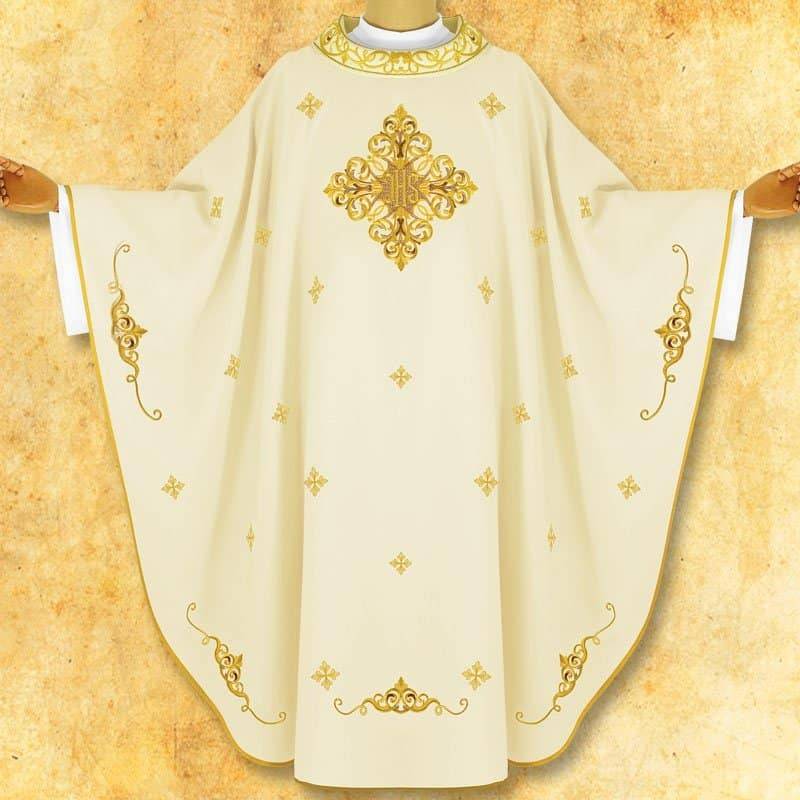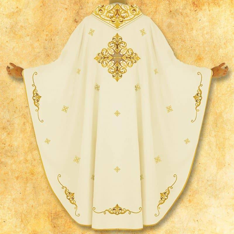 Magnifique chasuble "Vescovo" ( "évêque") avec son étole, décorée richement de broderies de qualité supérieure l'avant et l'arrière.