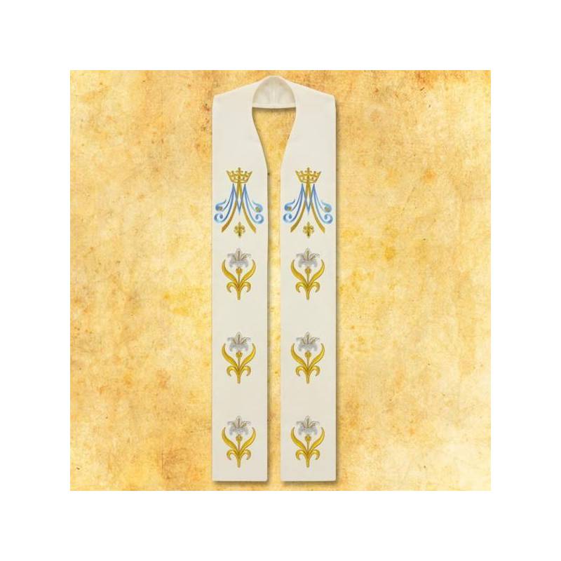 Chasuble Mariale l'avant et l'arrière décorée de broderies de qualité supérieure, finition bleu foncé. Etole intérieur approprié. Tissu : un mélange du fibres naturelles ( 40% bambou) et synthétiques, infroissable, tissu de couleur écru entrelacé d'un fil d'or Possibilité d'acheter plusieurs produits du même motif -voyez les propositions en bas.
