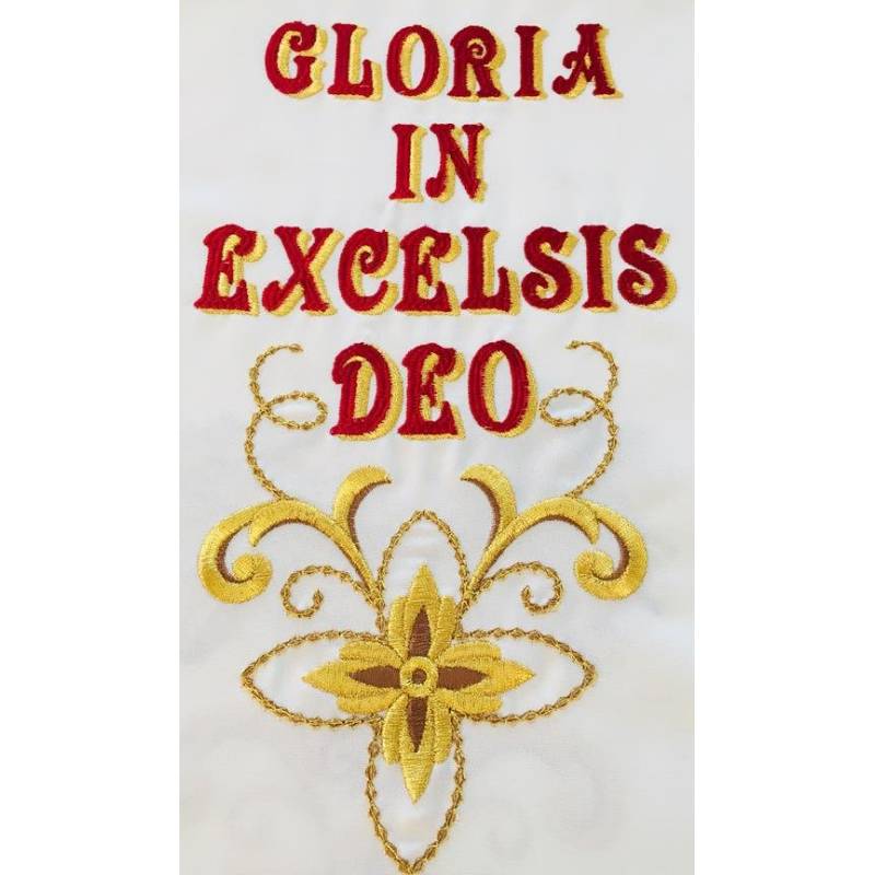 Voile de lutrin brodé "GLORIA IN EXCELSIS DEO" , motif: la crèche / 160x55 cm Tissu de bonne qualité, résistant au tâches, couleur blanc. Possibilité d'acheter plusieurs produits du même motif. Veuillez voir en bas ACCESSOIRES.