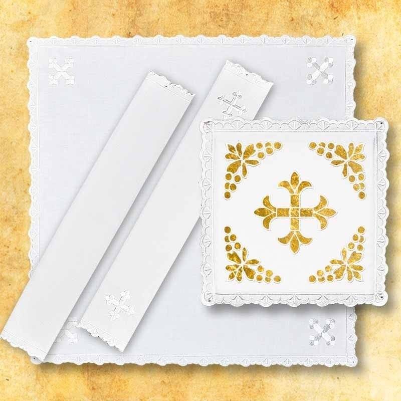 -pale brodée : 20 cm x 20 cm / corporal brodé : 45 cm x 45 cm / purificatoire brodé : 23 cm x 45 cm / manuterge à ourlet brodé : 23 cm x 45 cm