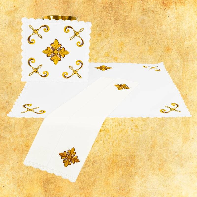 -pale brodée : 20 cm x 20 cm ( dedans un carré de plastique déhoussable pour le lavage) / corporal brodé : 45 cm x 45 cm / purificatoire brodé : 23 cm x 45 cm / manuterge à ourlet brodé : 23 cm x 45 cm
