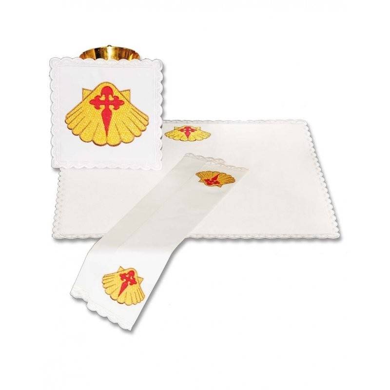 -pale brodée : 20 cm x 20 cm ( dedans: un carré de plastique déhoussable pour le lavage) / corporal brodé : 45 cm x 45 cm / purificatoire brodé : 23 cm x 45 cm / manuterge à ourlet brodé : 23 cm x 45 cm
