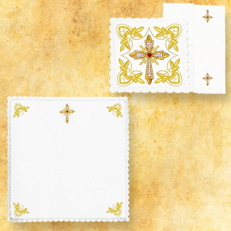 -pale brodée : 20 cm x 20 cm ( dedans un carré de plastique déhoussable pour le lavage) / corporal brodé : 45 cm x 45 cm / purificatoire brodé : 23 cm x 45 cm / manuterge à ourlet brodé : 23 cm x 45 cm