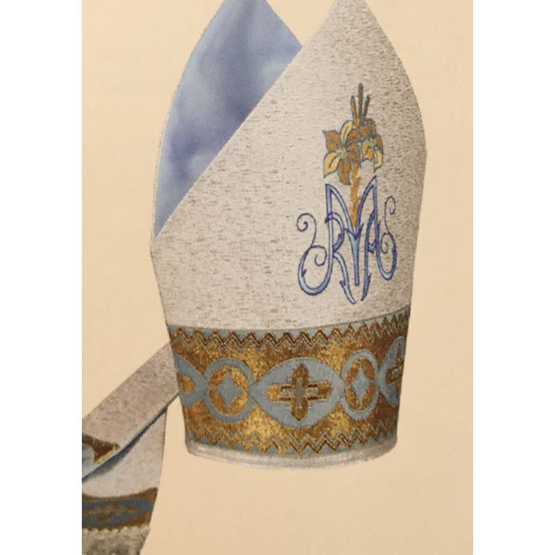 Mitre avec le motif Marial produite par un atelier de couture garantissant qualité, tradition et beauté. Disponible dans les circonférences suivantes : 56 - 57 - 58 - 59 - 60 - 61 cm.
