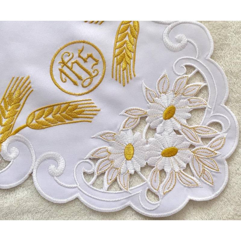 Possibilité d'acheter plusieurs produits du même motif: nappe 110x110, nappe 95x95, serviette 45x45, serviette 32x32cm, linge d’autel, pavillon de ciboire, dentelle brodée. Veuillez voir en bas ACCESSOIRES avec les liens.