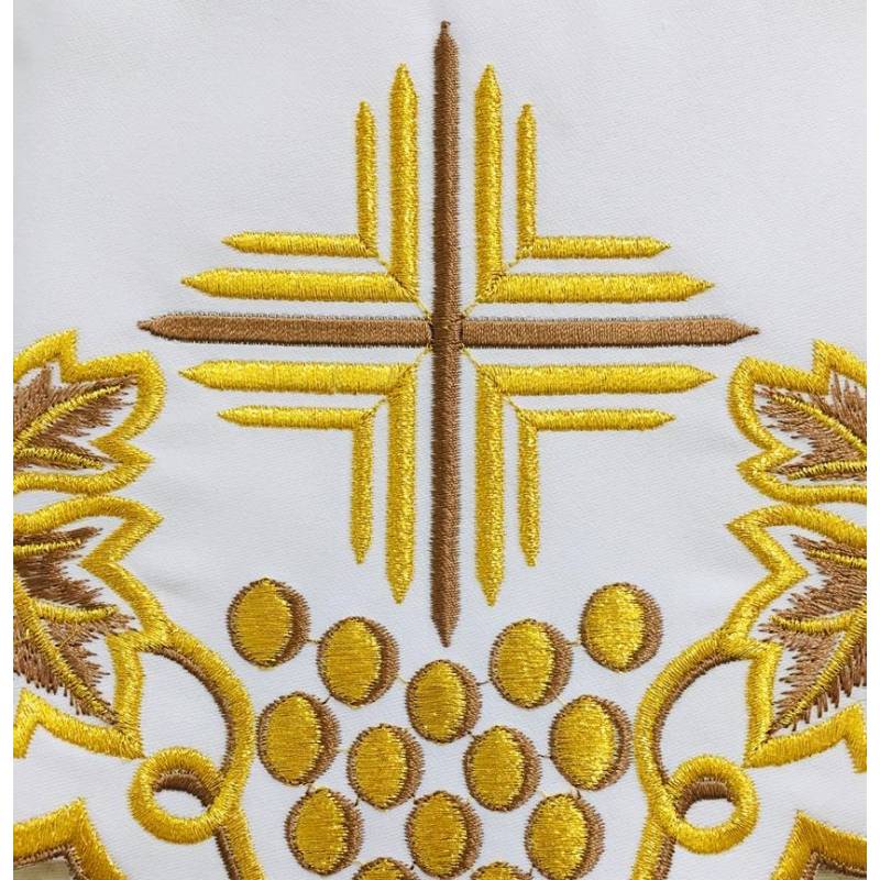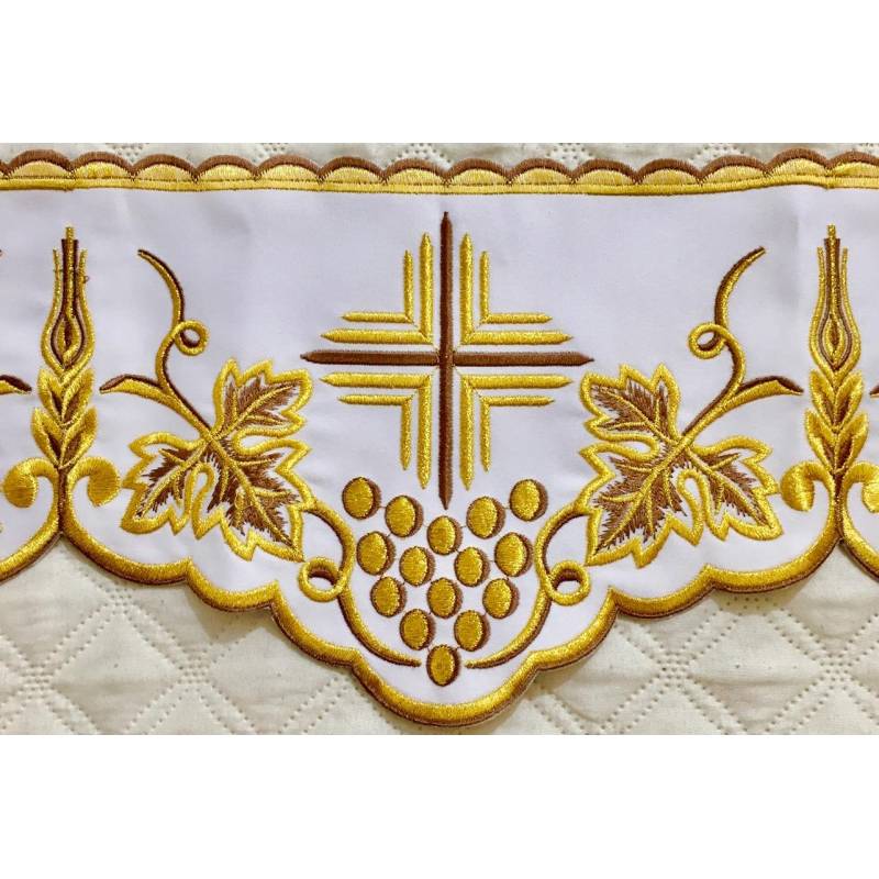 Nappe d'autel qui représente un grand sens de la beauté, l'esthétique et la qualité. Broderie dorée avec la CROIX et des VIGNES - 15cm de large.