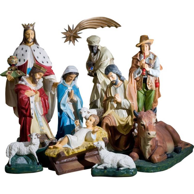 L'ensemble complet comprend : Sainte Famille , l' Ange, l'étoile, les 3 Rois Mages, les bergers debout et à genoux, un randonneur, les animaux: le bœuf, le chameau, les moutons et brebis, l'âne, le chameau.
