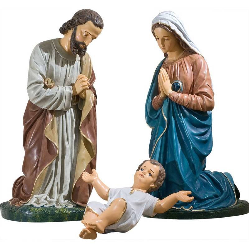 Santons de Crèche en résine réalisée par des artisans et peinte à la main. L'enfant Jésus, La Vierge Marie agenouillée, St Joseph de 60 cm.