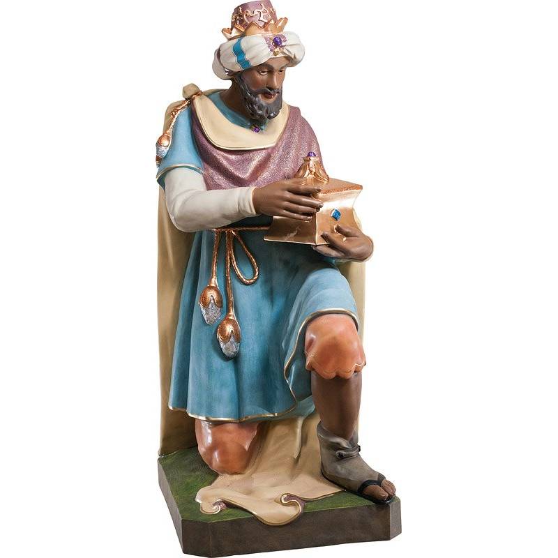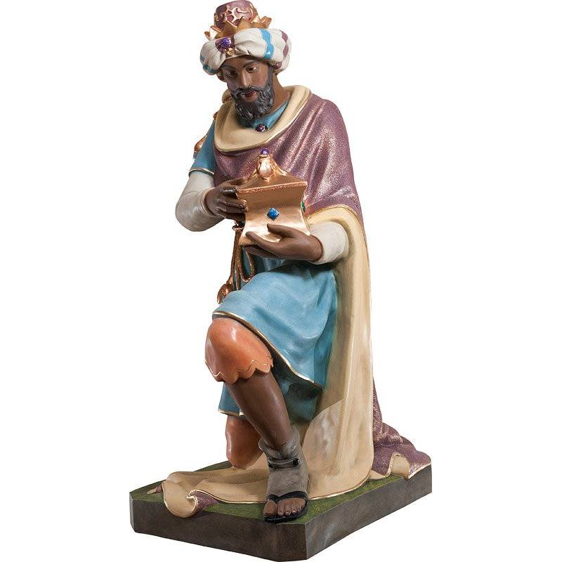 Statue Roi Mage à genoux 122cm en résine réalisée par des artisans et peinte à la main. Le Santon peut être vendu seul ou il peut faire partie de la Crèche n°280 avec le Santons debout 165cm. Disponible en version interne ou l’externe.